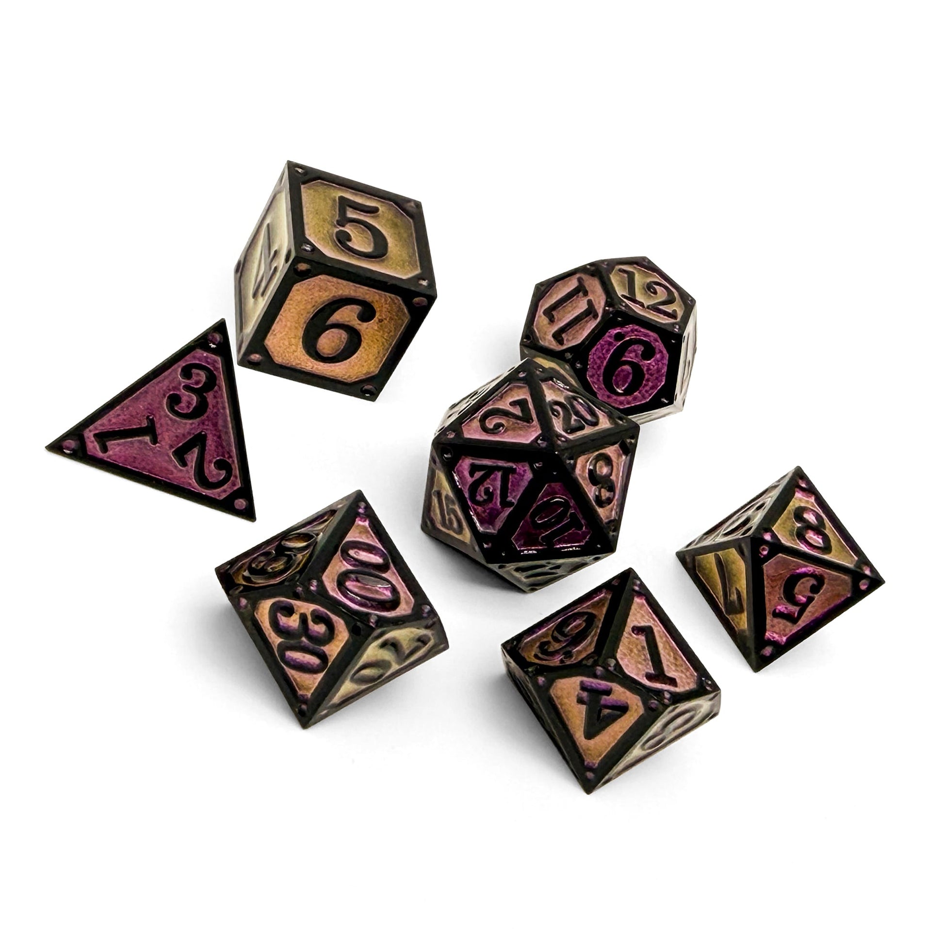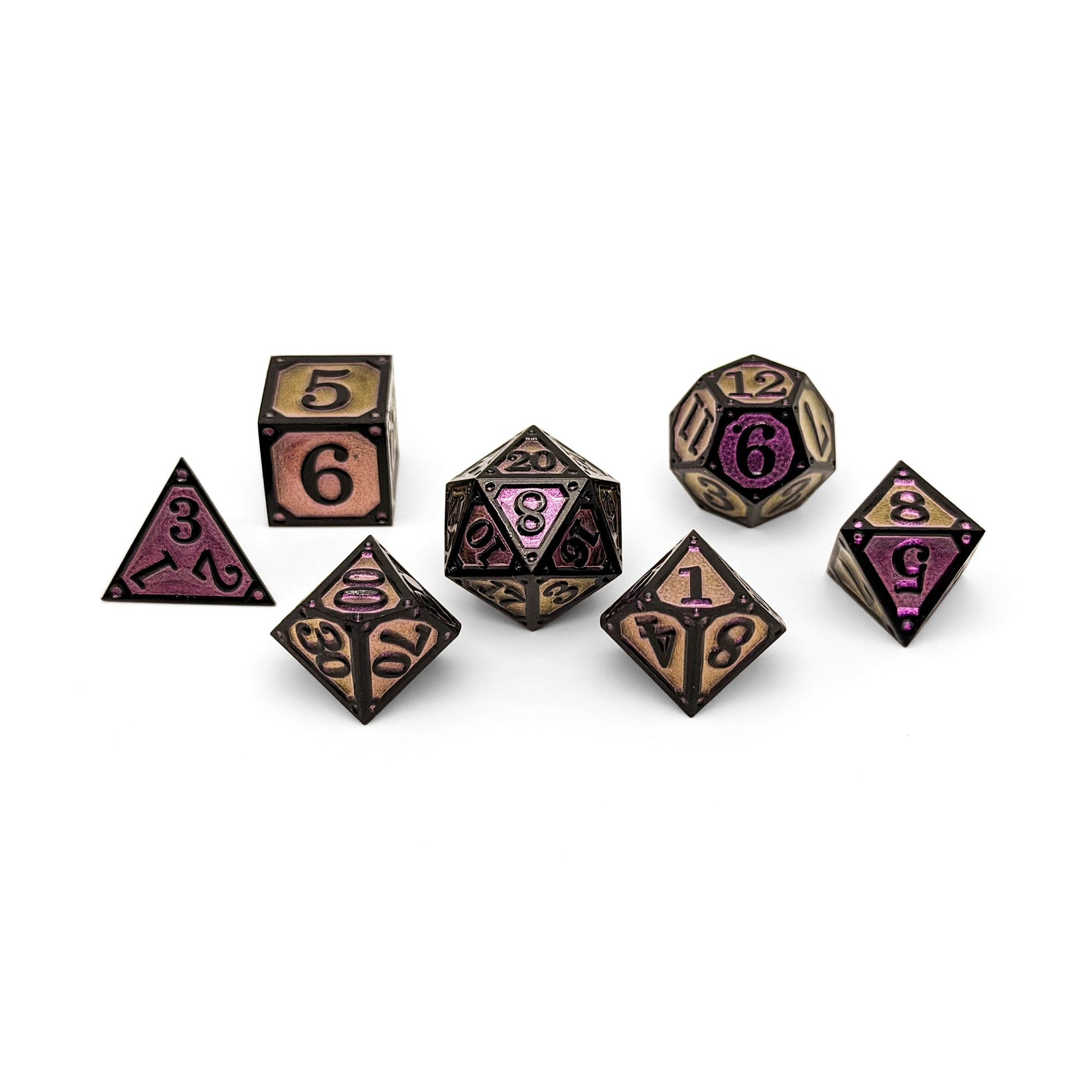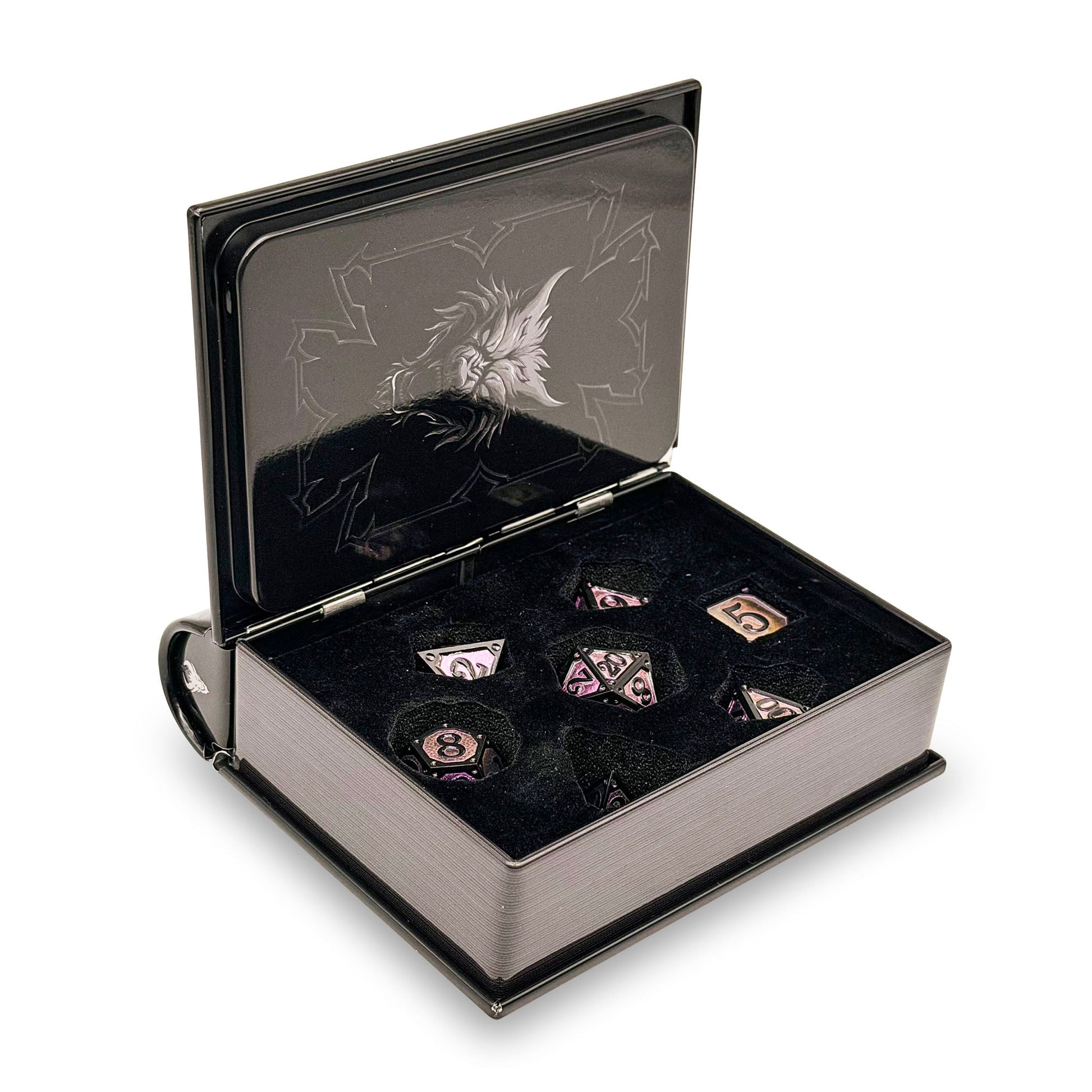From the shadows of forgotten graves emerges the Storybook – The Dead Risen dice set. Cloaked in midnight black and veined with haunting purple enamel, these dice embody the chill of necromancy and the call of restless spirits. Each roll carries the weight of lingering echoes from beyond, making them the perfect companion for dark campaigns, cursed artifacts, and tales of grim resurrection.
